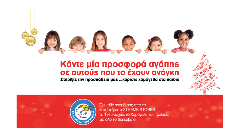 Αυτά τα Χριστούγεννα η σκέψη μας είναι στα παιδιά που έχουν ανάγκη. Το «Χαμόγελο του Παιδιού», ειδικά αυτές τις μέρες, έχει ανάγκη τη βοήθειά μας για να δώσει χαρά σε μικρά παιδιά που στερούνται των βασικών αγαθών. Βοήθησέ μας να στηρίξουμε αυτόν τον αγώνα, αφού με κάθε αγορά από όλα τα X-TREME STORES, το 1% θα δοθεί για αυτό το σκοπό. Τα X-TREME STORES, αυτή τη χρονιά, ζητούν κάτι περισσότερο από τη δύναμη και την αντοχή σου. Προσφέρουν κάτι περισσότερο από τα εφόδια που θα σε κάνουν να φτάσεις στο στόχο σου. Αυτή τη χρονιά, σε θέλουν σύμμαχο σε μια Μάχη πιο μεγάλη και πιο σημαντική. Γίνε αρωγός και στήριξε κι εσύ το «Χαμόγελο του Παιδιού» για να λάμψει στα πρόσωπα των παιδιών που έχουν ανάγκη.