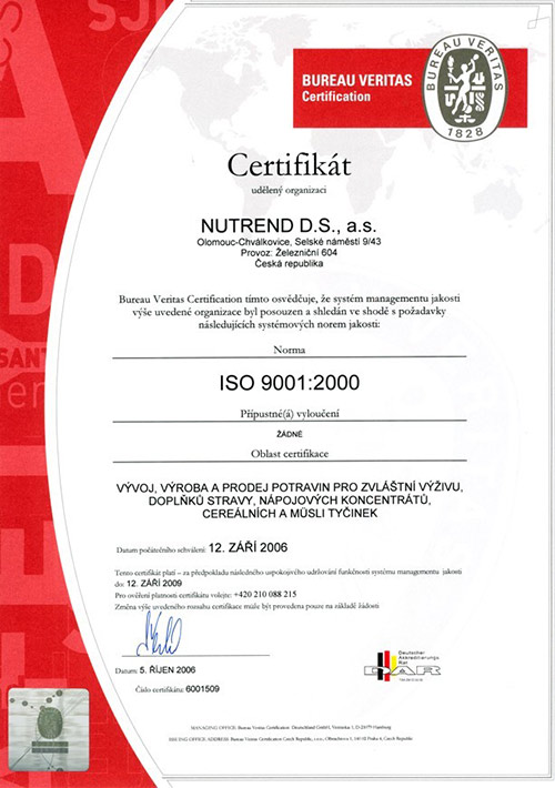 Στις 12.9.2009 η NUTREND D.S., a.s. πιστοποιήθηκε σύμφωνα με το ISO 9001: 2008.