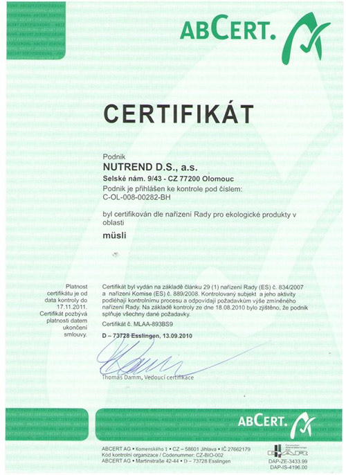 Στις 9.11. 2011 η NUTREND D.S., a.s. πιστοποιήθηκε σύμφωνα με τον κανονισμό του Συμβουλίου Βιολογικών Προϊόντων για προϊόντα μούσλι.