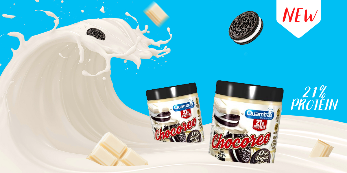 Το Chocoreo από την Quamtrax είναι μια εκπληκτική εναλλακτική λύση για ένα υγιεινό κι όμως εκπληκτικά γευστικό σνακ, με λίγες θερμίδες και πολύ πρωτεΐνη. Η φανταστική του γεύση είναι μία μίξη από λευκή σοκολάτα, φουντούκια και αληθινά κομμάτια από τα γνωστά μπισκότα Oreo! Δεν περιέχει καθόλου επιπλέον ζάχαρη ή φοινικέλαιο. Περιέχει 21% πρωτεΐνη και πολύ χαμηλή ποσότητα υδατανθράκων.